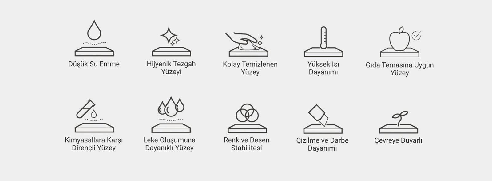 Isıya, çizilmeye ve lekelere karşı yüksek direnç sunar. Günlük kullanımda hijyenik ve uzun ömürlü bir yüzey sağlar.